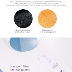 ● Global Selected High-quality Filtering Material with LK natural coconut shell active carbon and UK sodium-free icon-exchange resin, produces pores within each grain of carbon, creating tiny tunnels and spaces