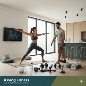 Just like the minimalist living room in our scene, having a clean, organized, and inviting space can boost your motivation. You don’t need an expensive home gym — a yoga mat, resistance bands, and a pair of dumbbells are enough to get started.